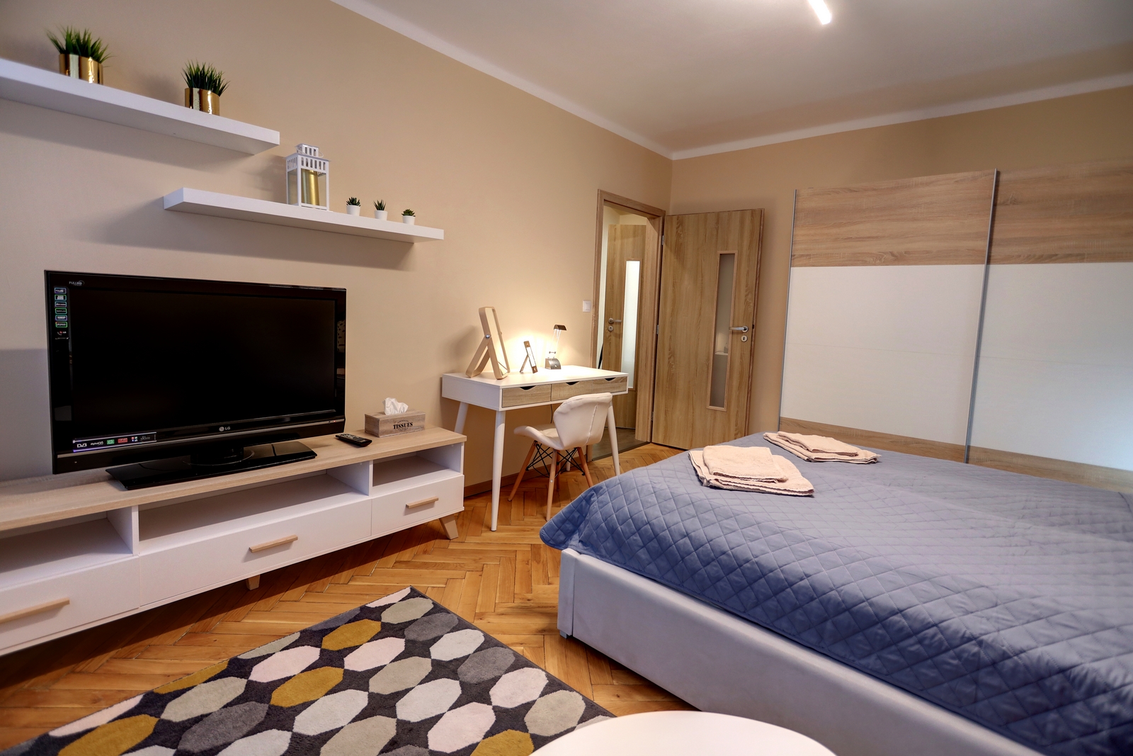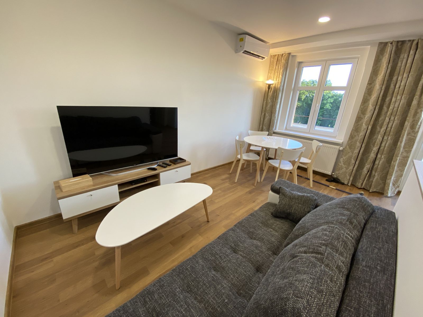 V obývacím pokoji je k dispozici velkoplošná smart LCD televize s úhlopříčkou 150 cm.