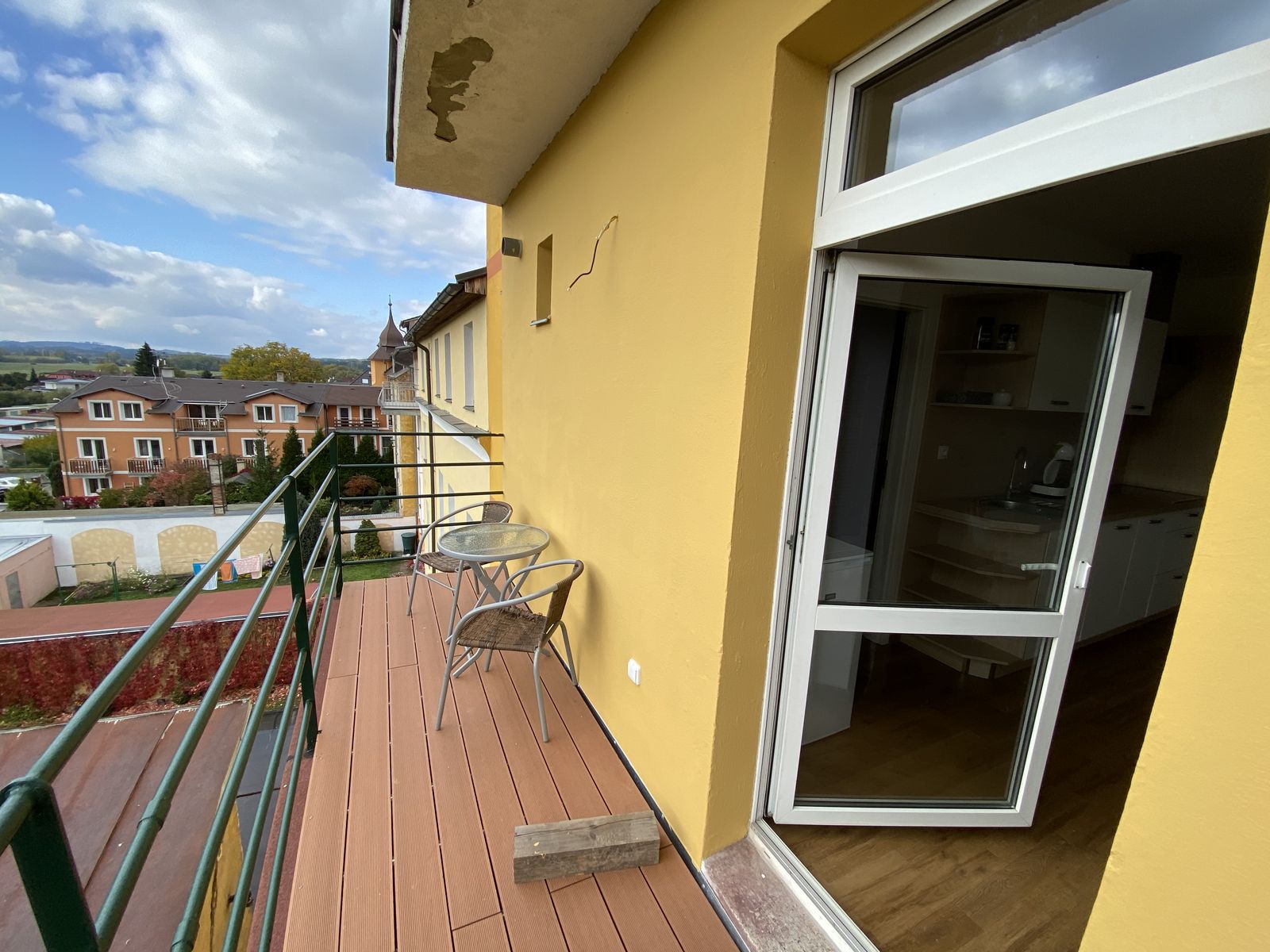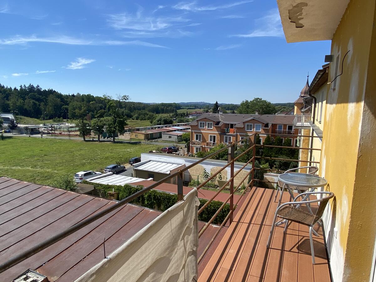 K bytu náléží prostorný jižně orientovaný balkon přístupný z obývacího pokoje. Z balkonu se nabízí výhled na park s jezírkem